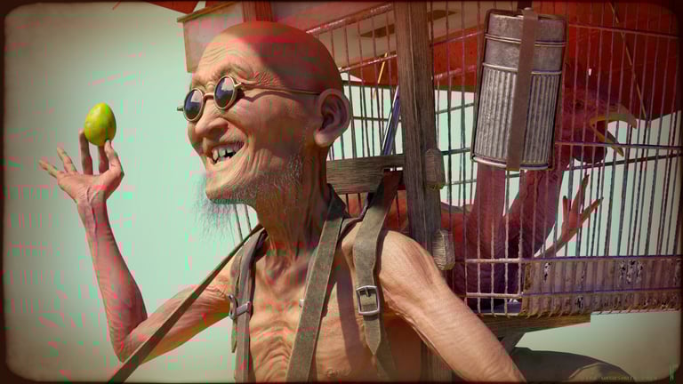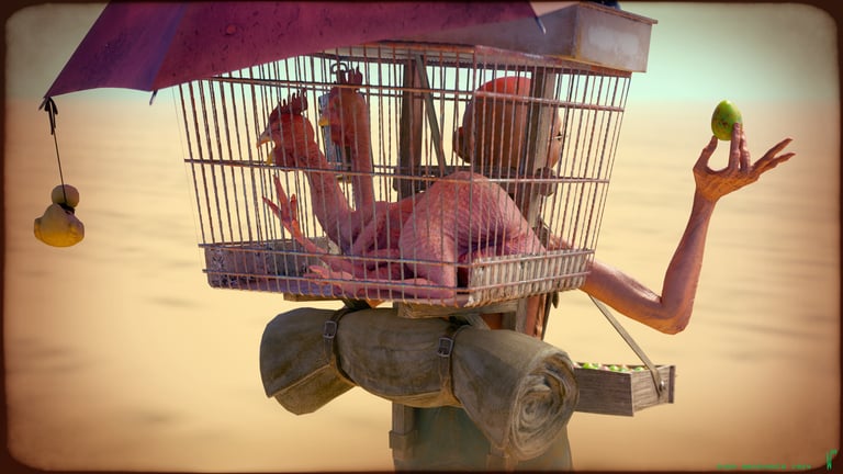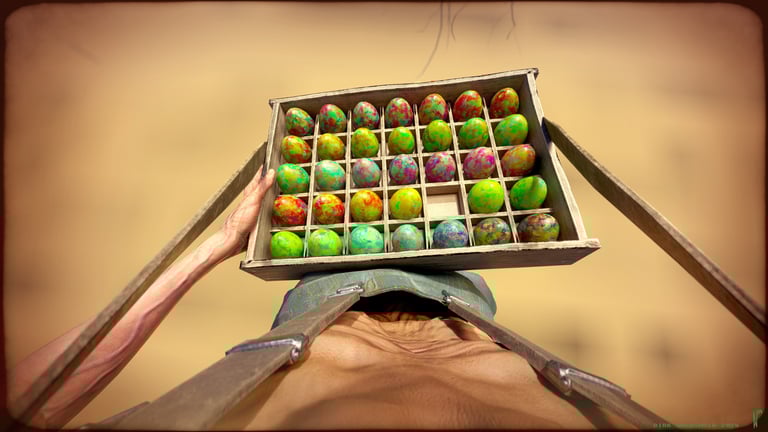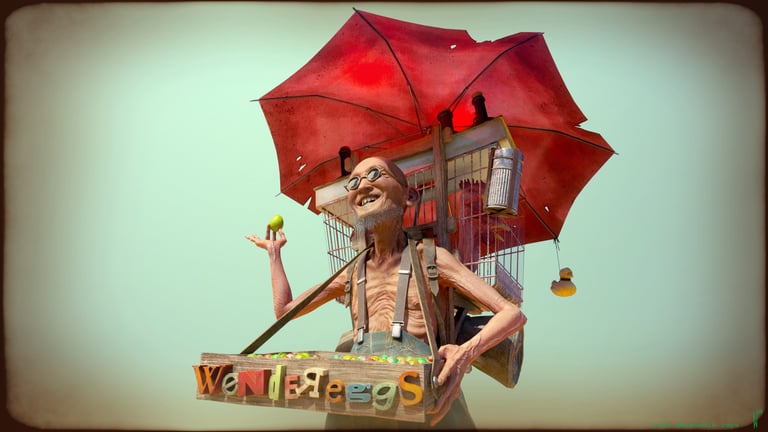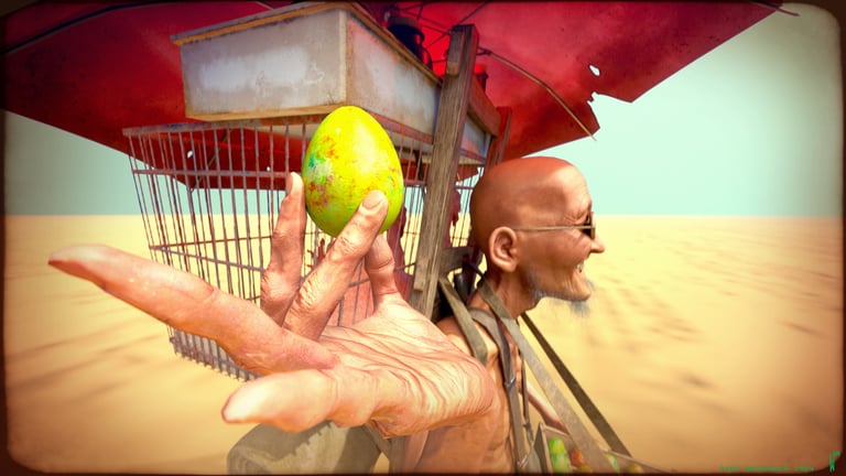'Wondereggs' is a travelling alchemist or quack of sorts who creates psychoactive eggs with the help of his mutant chicken that he lovingly cares for. He magically appears to those dying of thirst in the depths of the desert and leads them to a better world with the eggs. According to legend, it is several hundred years old.