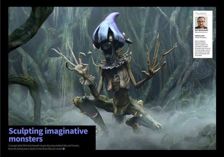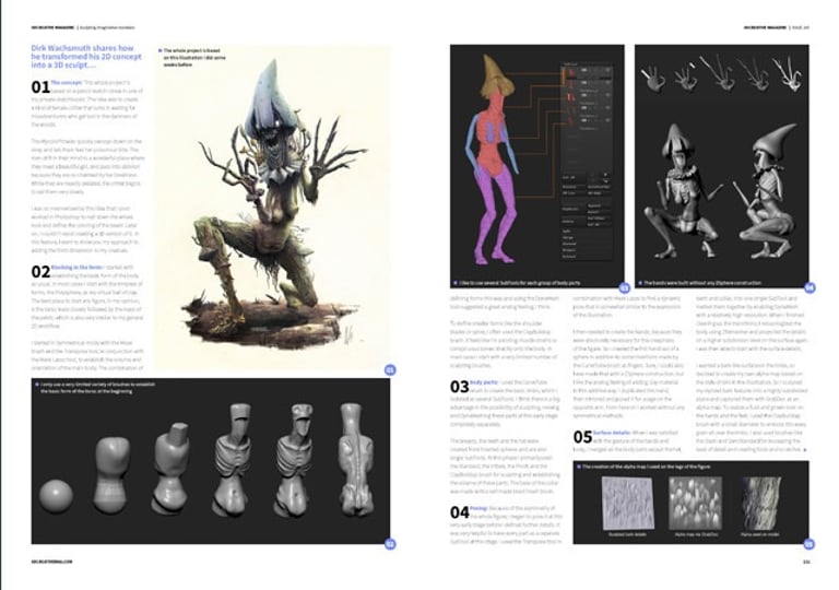I'm very glad that I got the opportunity to show my process in detail in issue 109. Here you can see how I transformed my 2D concept of this critter into a 3D sculpture. It started with a quick doodle in one of my sketchbooks, later I painted the colored 2d concept. This was a great foundation for the ZBrush project.