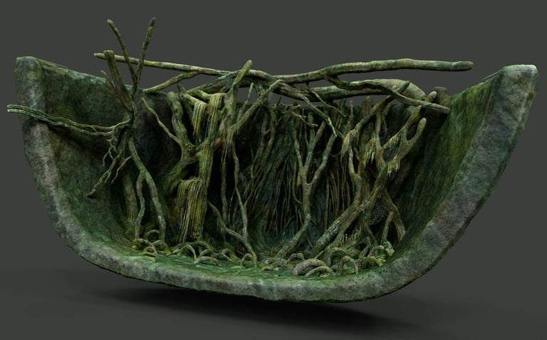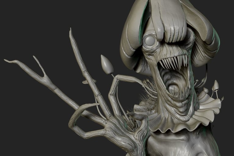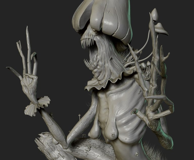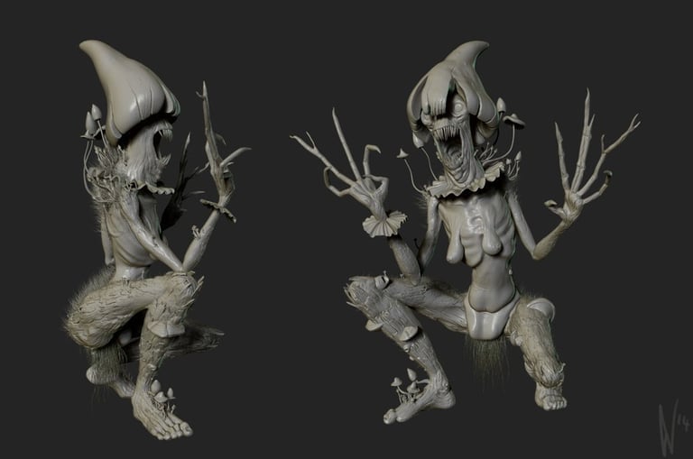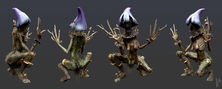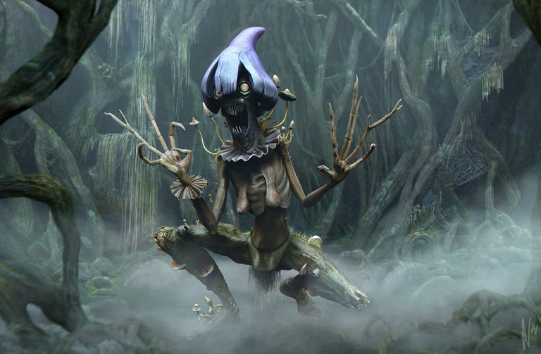 The ‘Mycoid Prowler’ is a scary, vegetal critter that creeps on the ground of dark and mossy woods. People say it was a beautiful girl which was getting lost in the cursed forest, hundreds of years ago. Legend relates that one bite of her will take you to a fantastic place where you meet this girl in her past gorgeous beauty. But in the meantime it will eat you slowly.