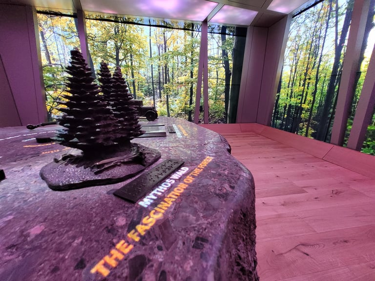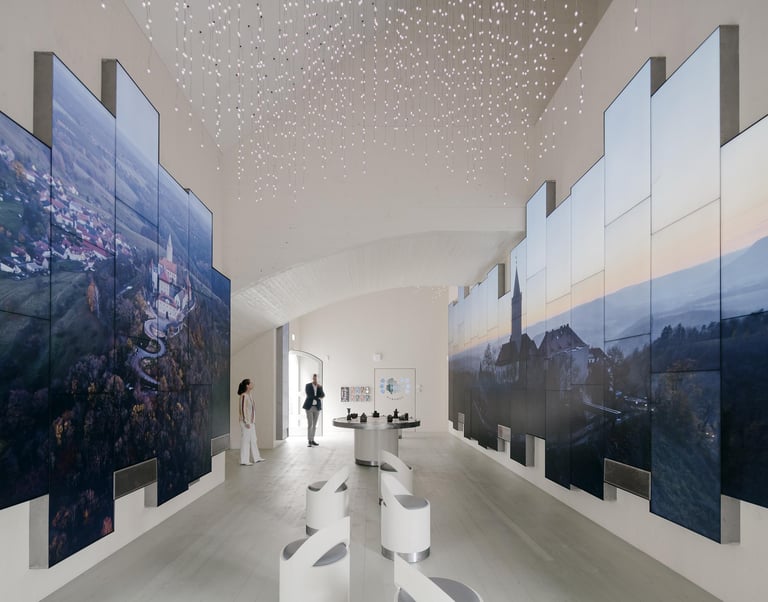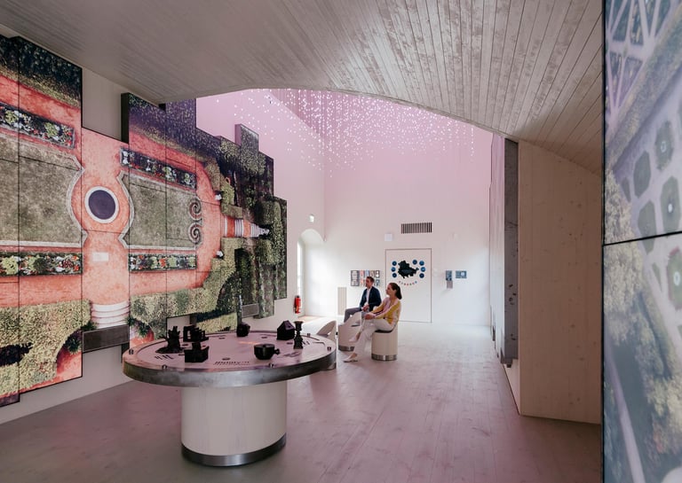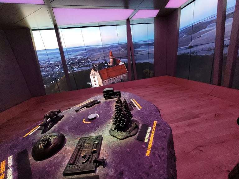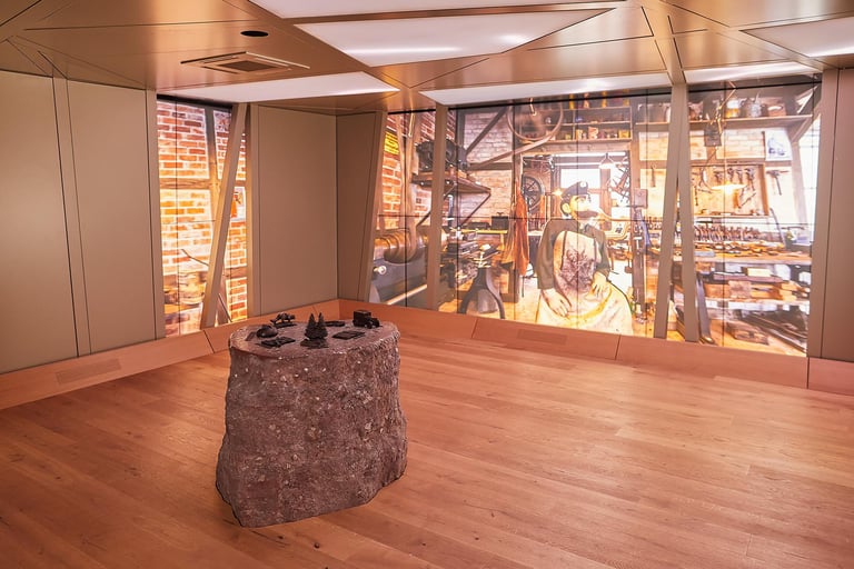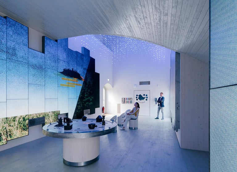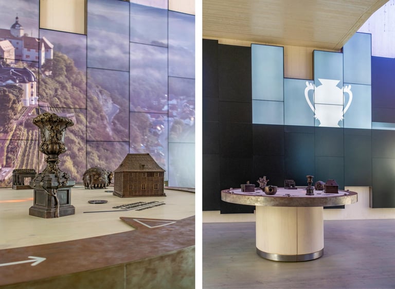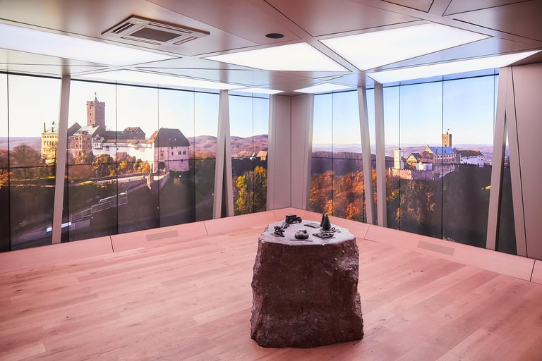 A 360° media room was created for the Wartburg Portal in the castle's historic coach house. Light, sound and the large-format video walls create an immersive space and allow visitors to immerse themselves in the atmosphere of the most exciting places in Thuringia. An experience lounge offers the opportunity for in-depth exploration and new seminar rooms on the upper floor expand the educational offerings at Wartburg Castle. Here you can interact with my sculptures mounted on a real Wartburg stone to trigger the corresponding media presentations.